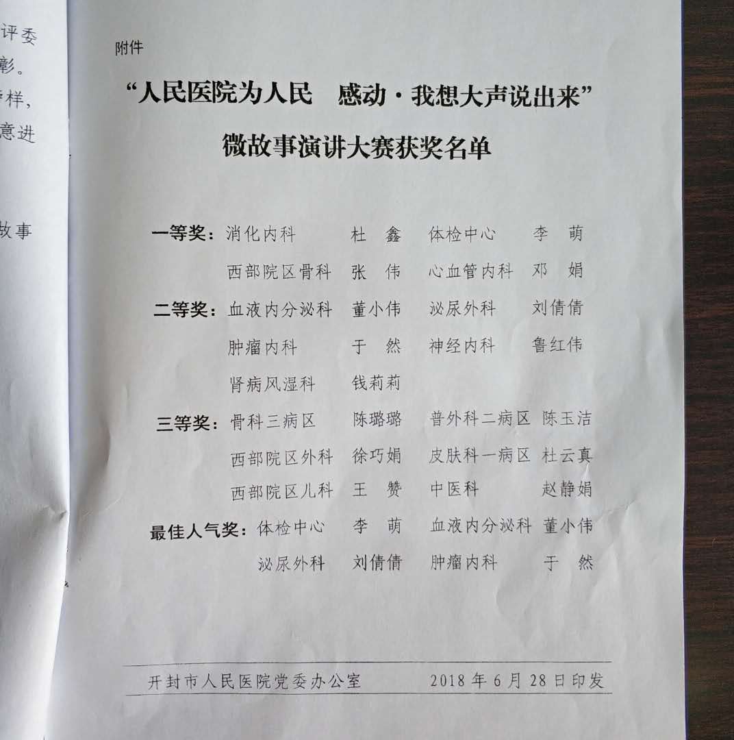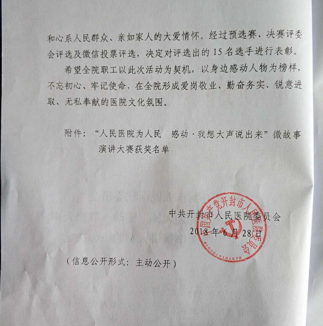 中共開封市人民醫(yī)院委員會關(guān)于“人民醫(yī)院為人民 感動·我想大聲說出來”微故事演講大賽的表彰決定