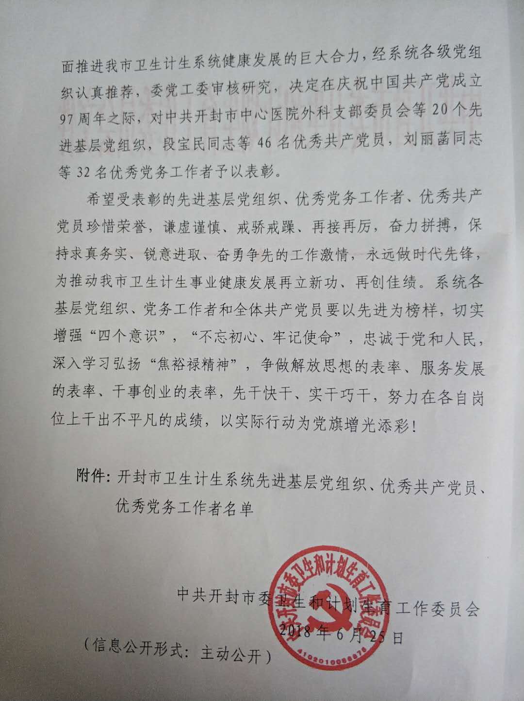 中共開封市委衛(wèi)生和計劃生育工作委員會關(guān)于表彰全市衛(wèi)生計生系統(tǒng)先進基層黨組織、優(yōu)秀共產(chǎn)黨員和優(yōu)秀黨務工作者的決定