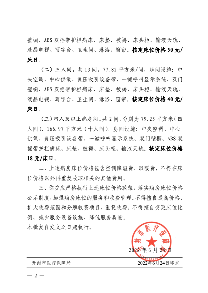 開封市醫(yī)療保障局 關(guān)于開封市人民醫(yī)院醫(yī)養(yǎng)中心新建病房樓 病房床位價格的批復(fù)