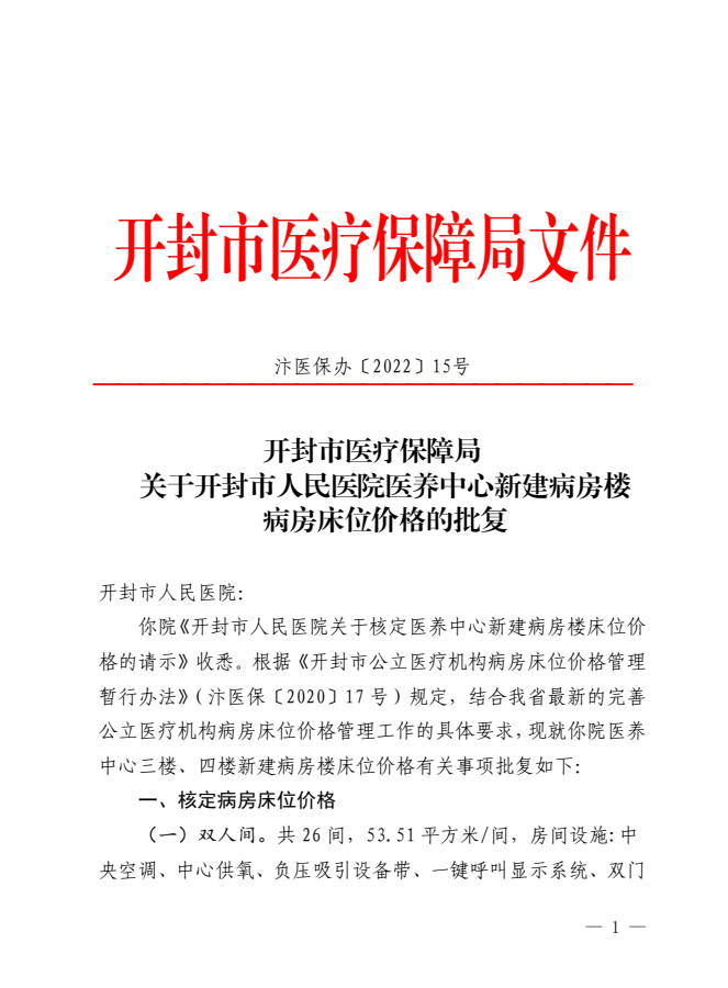 開封市醫(yī)療保障局 關(guān)于開封市人民醫(yī)院醫(yī)養(yǎng)中心新建病房樓 病房床位價格的批復(fù)