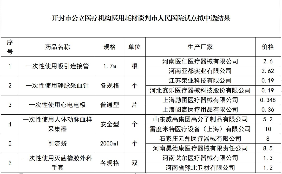 附件:開封市公立醫(yī)療機(jī)構(gòu)醫(yī)用耗材談判市人民醫(yī)院試點(diǎn)擬中選結(jié)果